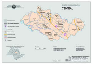 Mapas individuais das regiões administrativas e metropolitanas do Estado com as divisas municipais, principais cursos d'água, rodovias e aeroportos.