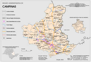 Mapas individuais das regiões administrativas e metropolitanas do Estado com as divisas municipais, principais cursos d'água, rodovias e aeroportos.